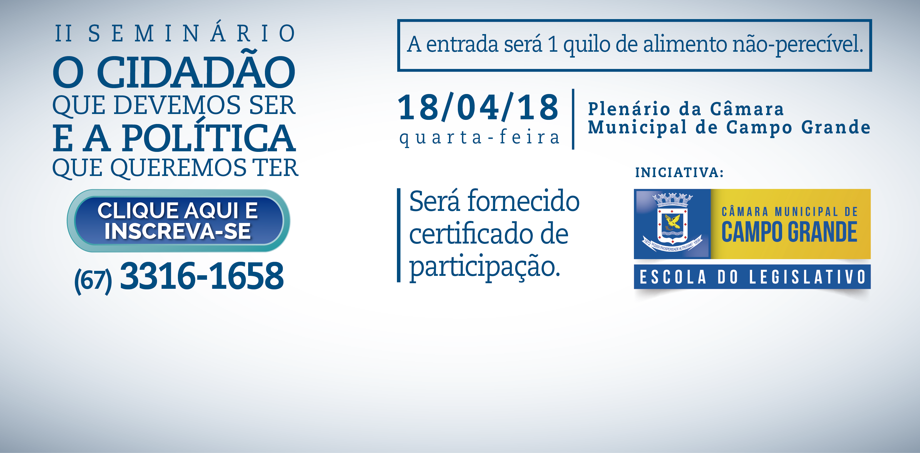 O Plenário Oliva Enciso, na Câmara Municipal de Campo Grande, sedia no próximo dia 18 de abril, a partir das 14h, a segunda edição do seminário “O Cidadão que Devemos Ser e a Política que Queremos Ter”. O projeto é uma iniciativa da própria Casa de Leis, através da Escola do Legislativo, e a entrada será um quilo de alimento não perecível.